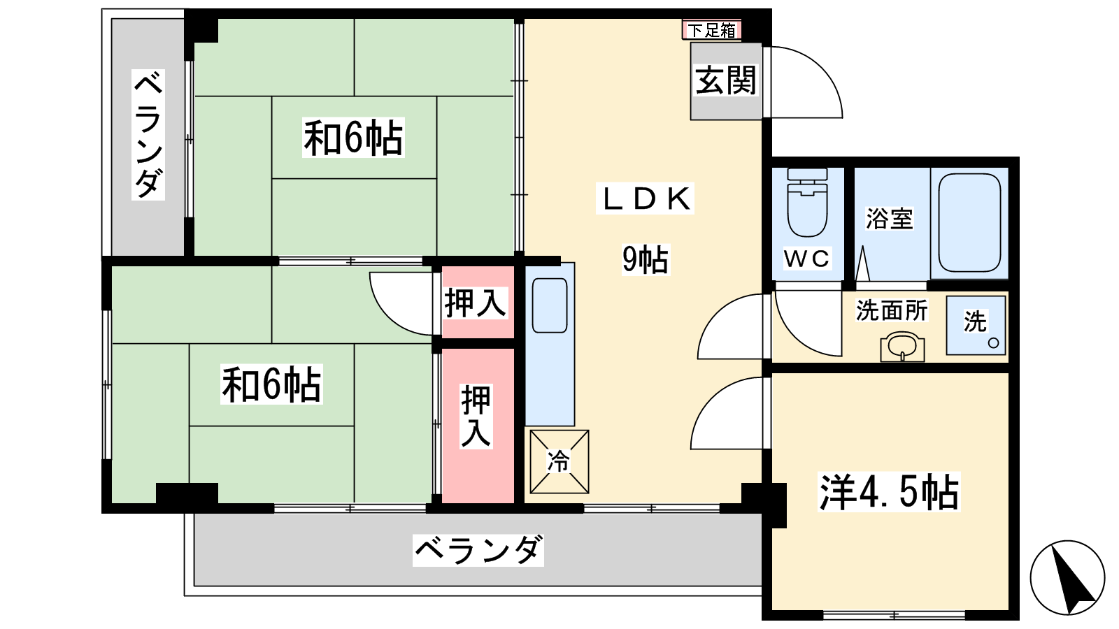 - 洋室4.5帖、和室6帖、和室6帖、LDK9帖