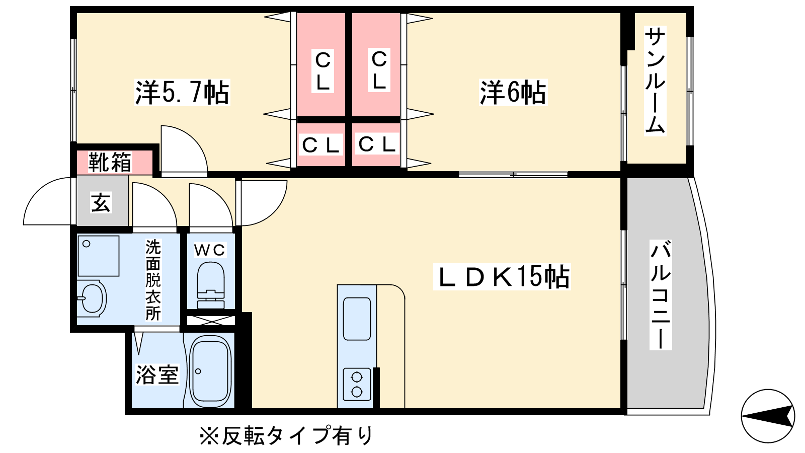 - 洋室6帖、洋室5.7帖、LDK15帖