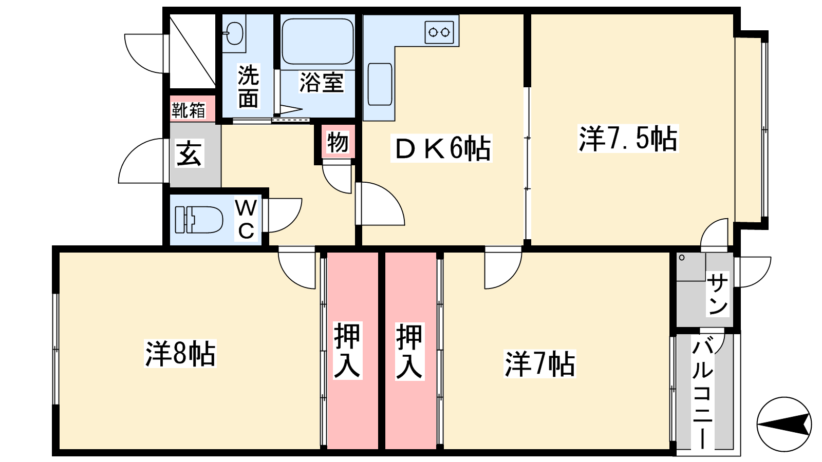 - 洋室8帖、洋室7.5帖、洋室7帖、DK6帖