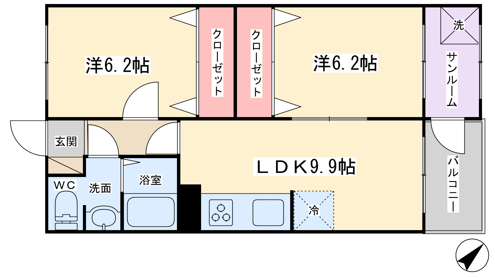 - LDK9.9帖、洋室6.2帖、洋室6.2帖