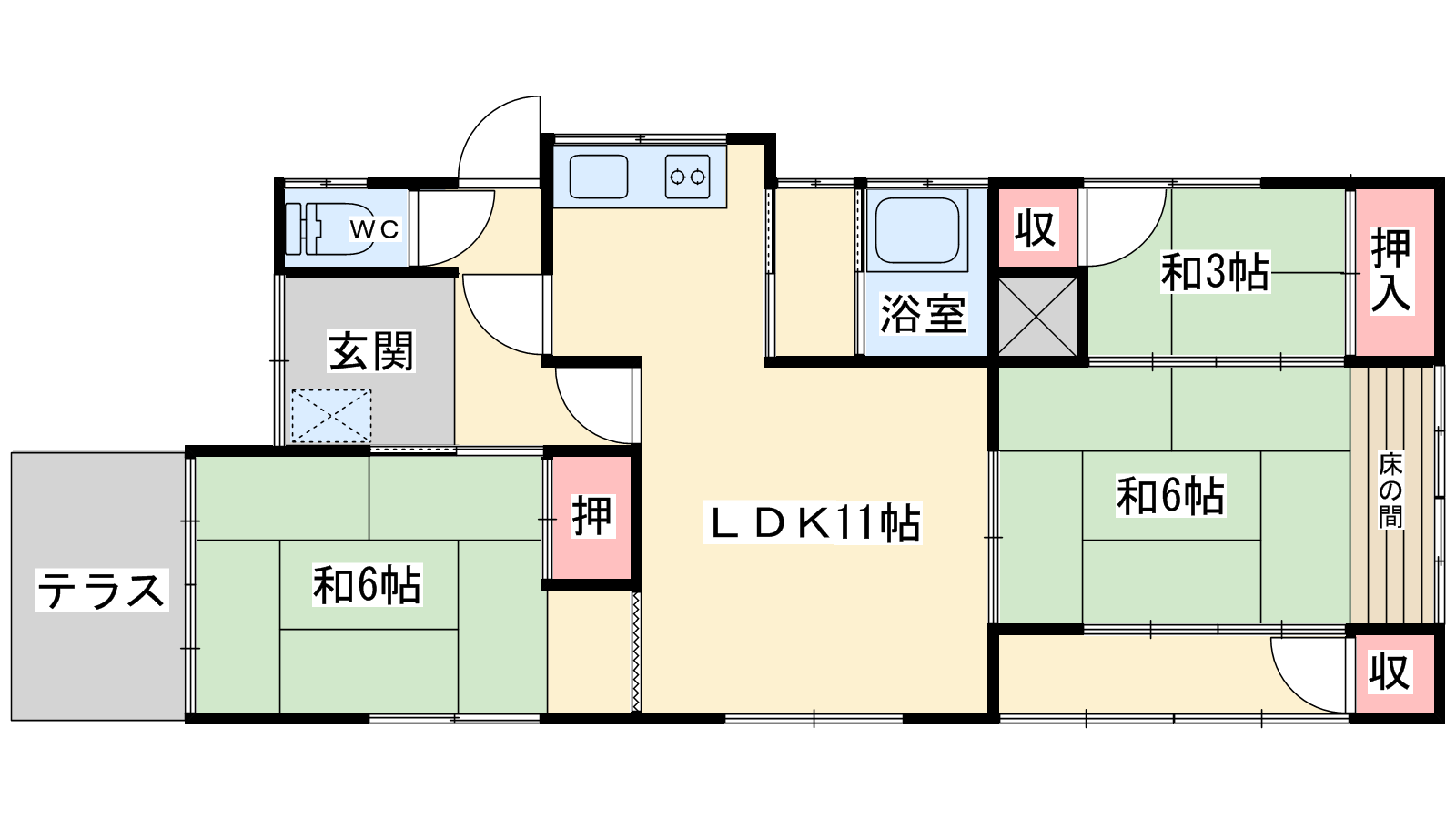- LDK11帖、和室6帖、和室6帖、和室3帖