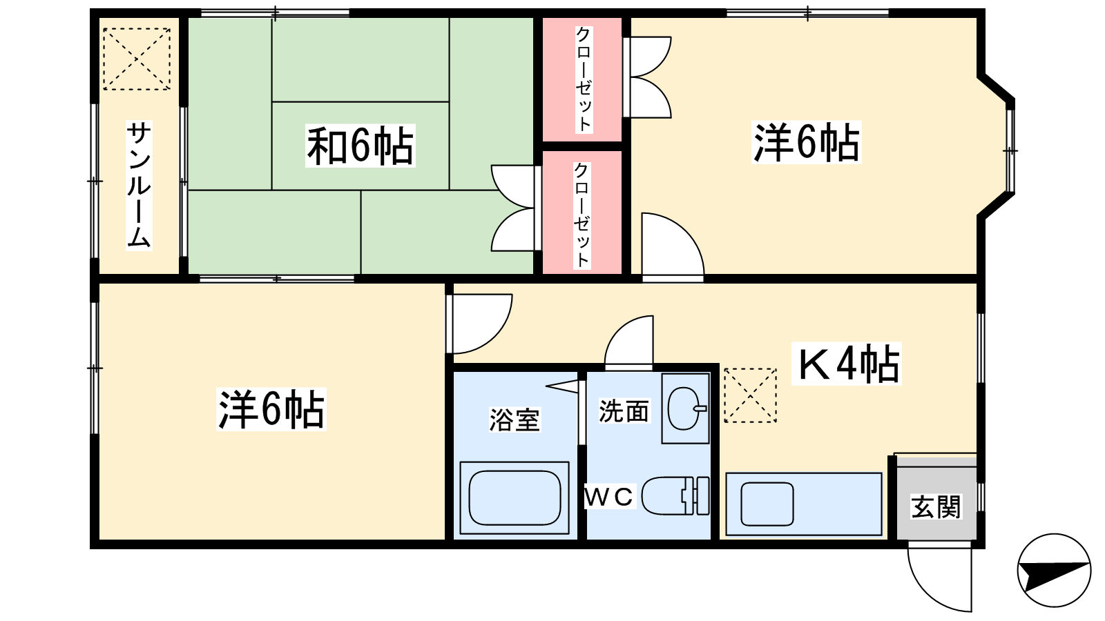 - K4帖、洋室6帖、洋室6帖、和室6帖