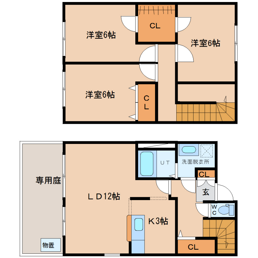 - LD12帖、K3帖、洋室6帖、洋室6帖、洋室6帖