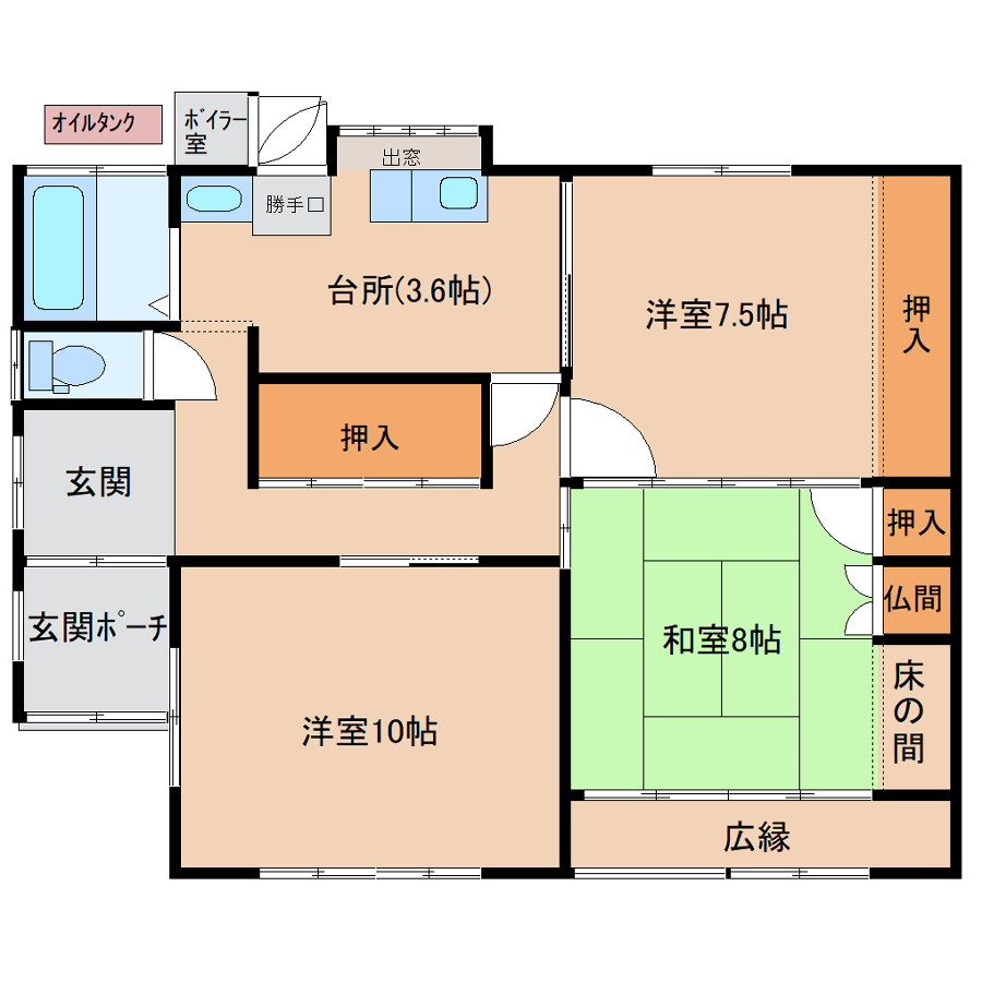 - K3.6帖、洋室7.5帖、洋室10帖、和室8帖
